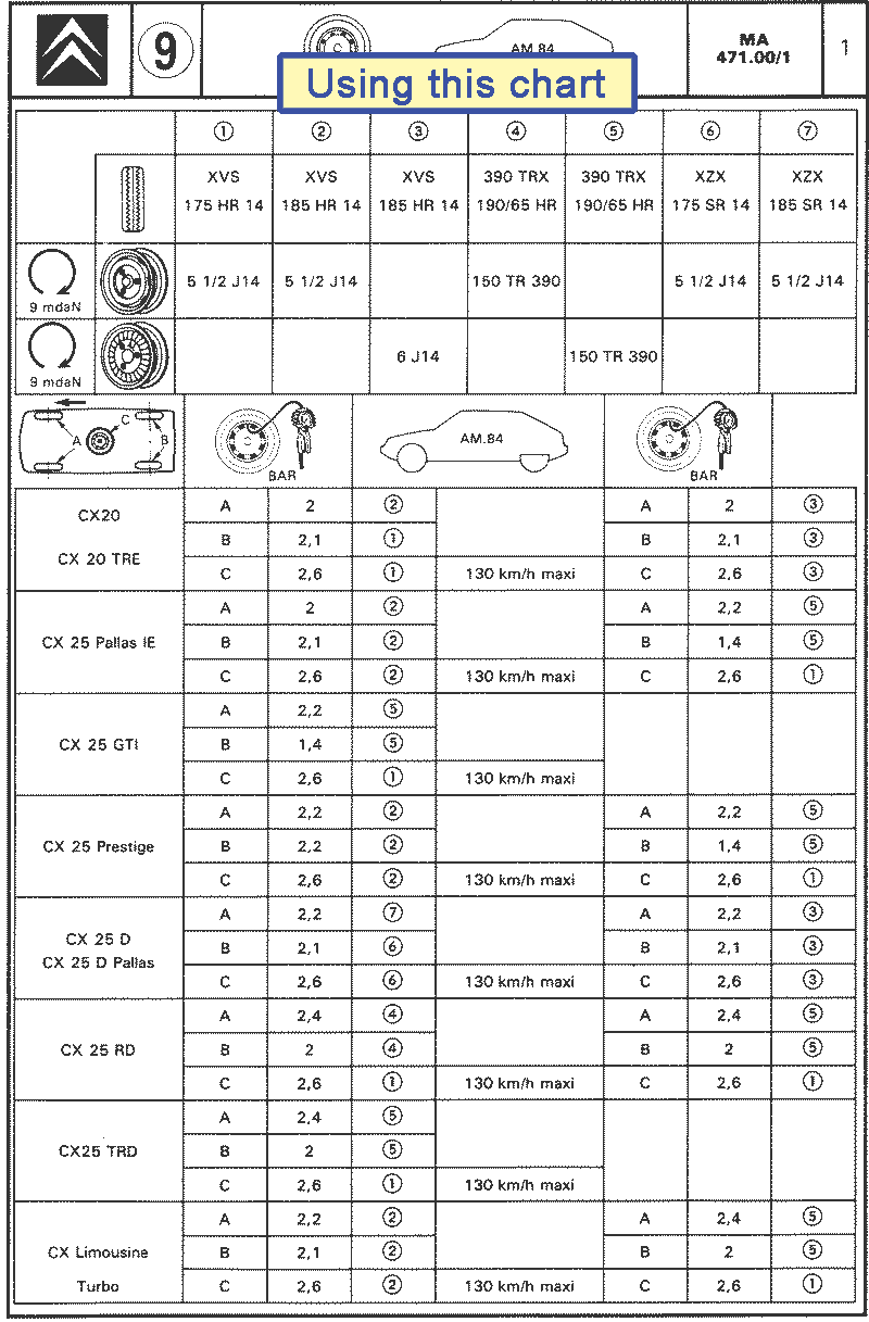 In the main table you will see a column with model designations, across from that are three columns. The first has the tire/wheel location letter, next the pressure in bars and finally the tire/wheel combination. Notice then a wider column, this specifies the maximum speed recommended for the spare tire when installed on the car. The next three columns repeat the first three, but have a optional tire/wheel combination.